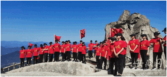 據(jù)了解,天柱山風(fēng)景區(qū)當(dāng)天舉行了“立天柱之巔·燃愛國之情”活動。此次活動由天柱山風(fēng)景區(qū)組織,潛山各行各業(yè)共72名青年參加,統(tǒng)一佩戴黨徽,身穿“我愛你中國”紅色T恤,佩戴“我愛你中國”紅色口罩,佇立在天柱山第二高峰1426米的天池峰之巔,手握紅旗,告白祖國,歌唱祖國,齊祝祖國繁榮昌盛,國泰民安。