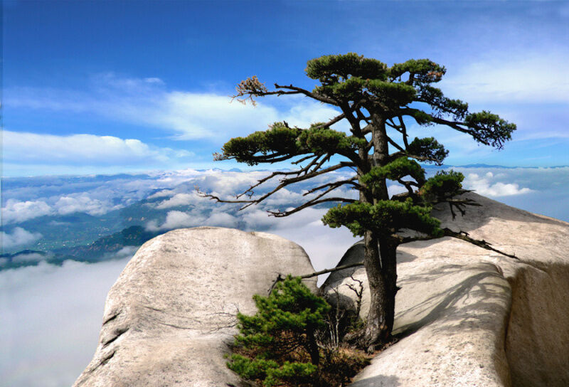 這些生長在石縫里的松樹,根部能夠分泌出一種酸性的物質(zhì),腐蝕石頭的表面,使其化出養(yǎng)分供自己吸收。為了從石頭里尋覓生機,也為了牢牢抓住絕壁,它們的根日日夜夜與石頭搏斗著,最終穿入堅如鋼鐵的石體,讓人感受到寧靜之中蘊藏的無窮力量。