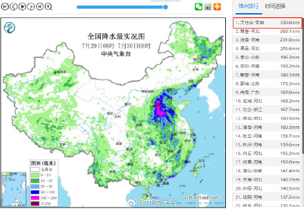 受“杜蘇芮”殘留云系影響,安徽天柱山昨天夜間開始出現(xiàn)猛烈降雨,29日08時(shí)-30日08時(shí)的24小時(shí)降水量達(dá)330毫米,達(dá)特大暴雨級(jí)別,是過去24小時(shí)里全國降雨最強(qiáng)的國家站,也是該站點(diǎn)自1949年來單日降水量第一。