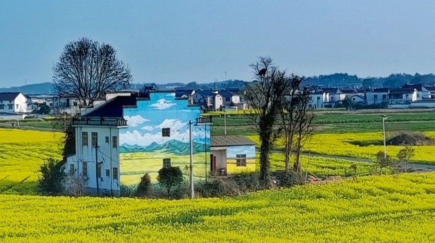 遠(yuǎn)處農(nóng)家白墻灰瓦錯(cuò)落有致,