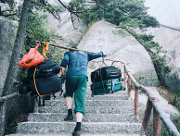 特色: 在天柱山上,經常能碰到挑山工。他們肩上搭一根光溜溜的扁擔,兩頭垂下幾根繩子,掛著沉甸甸的物品。登山的時候,他們一只手搭在扁擔上,另一只手杵著大杵,保持身體平衡。他們的路線是折尺形的--先從臺階的左側起步,斜行向上,登上七八級臺階,就到了臺的右側;便轉過身子,反方向斜行,到了左側再轉回來,每次轉身,扁擔換一次肩。他們這樣曲折向上登,才能使掛在扁擔前頭的東西不碰...